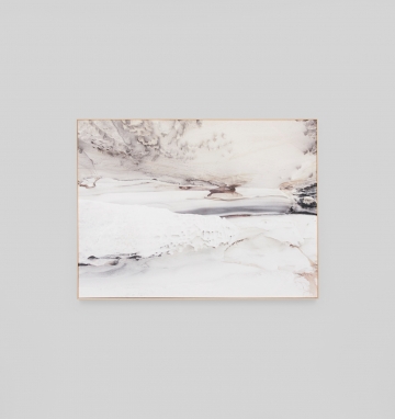 Stretched cotton blend canvas, timber veneer outer frame, pine stretcher backing frame.