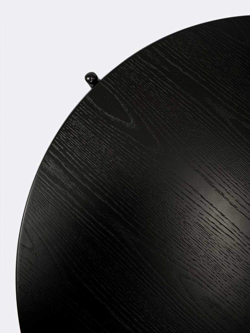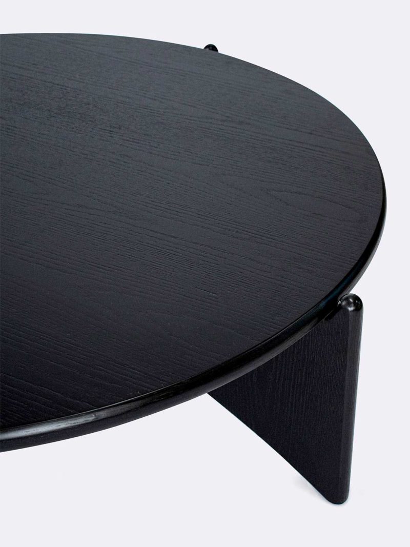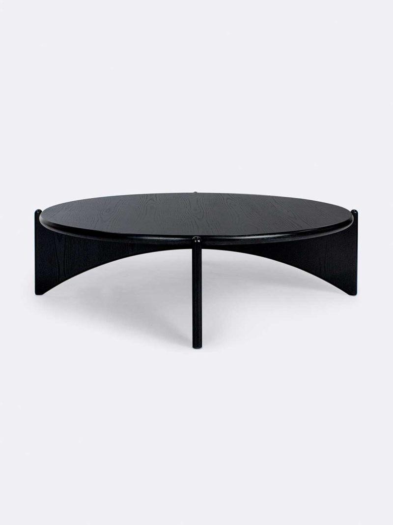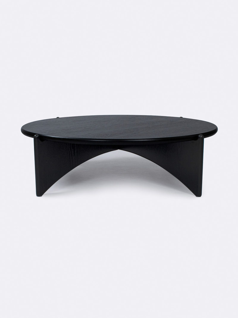 Round black oak veneer coffee table with arched cross joined base.