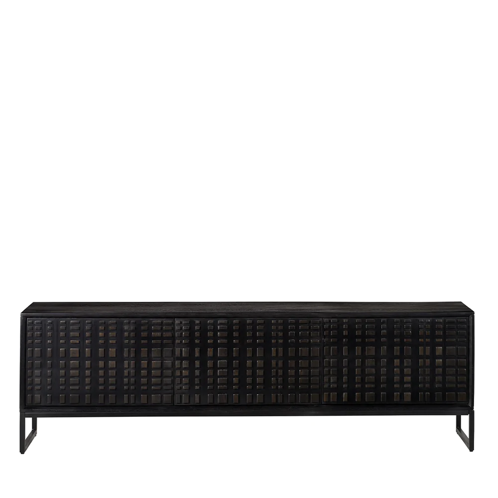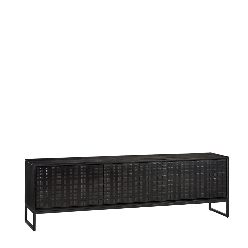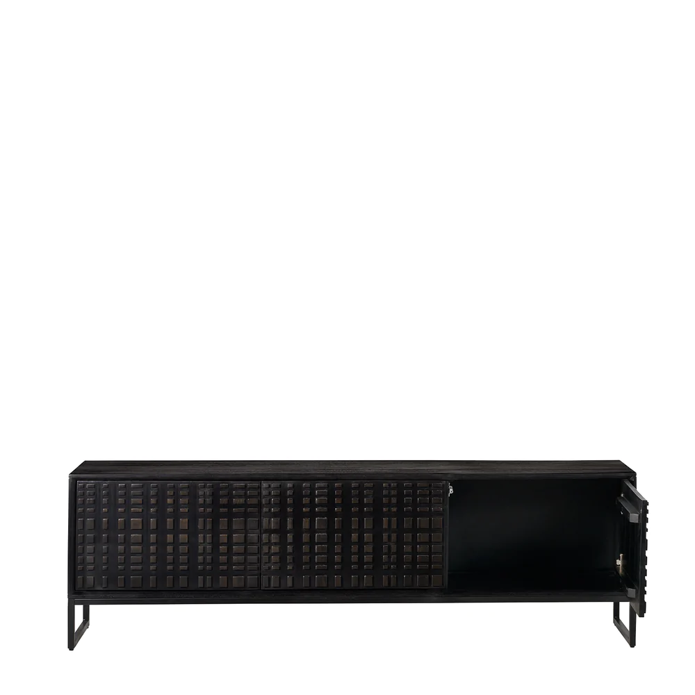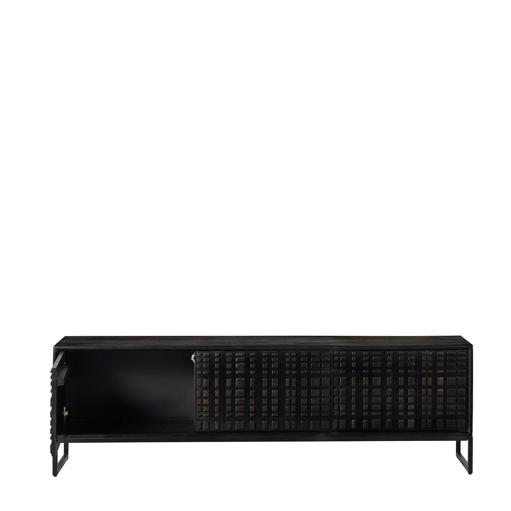 The Ingot TV Cabinet in black stained mango wood with powder coated legs will meld storage with style. The 3 doors provide sleek access – with no handles to spoil the handcrafted & detailed wood finish, the Ingot TV cabinet will give your home the stylish display & storage it deserves. Teams perfectly with the Ingot Sideboard, Ingot Cabinet or Ingot dining table.