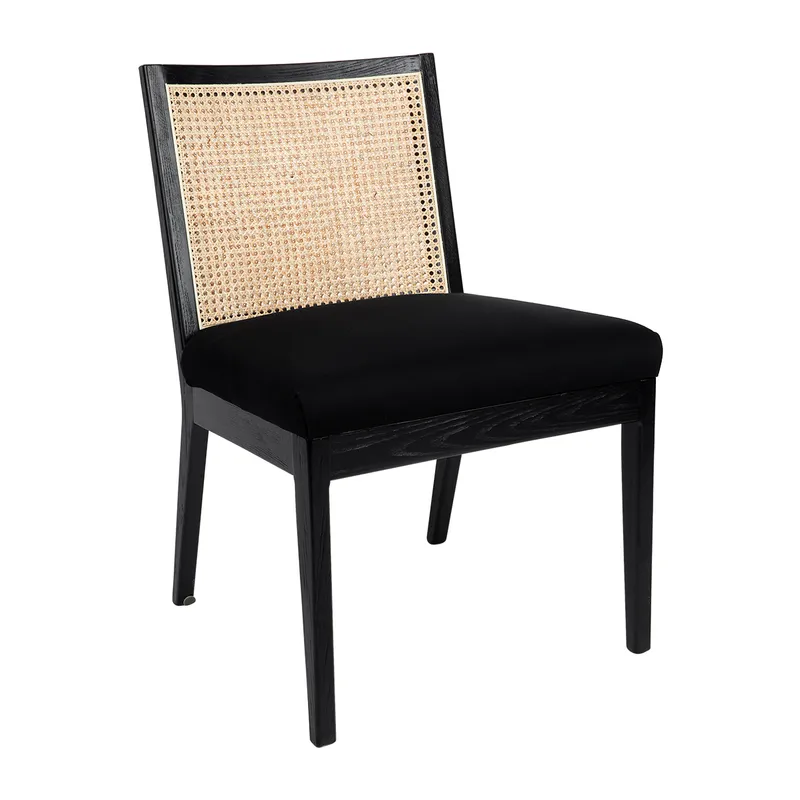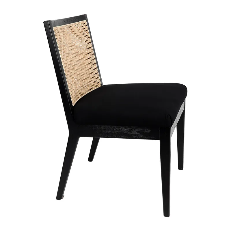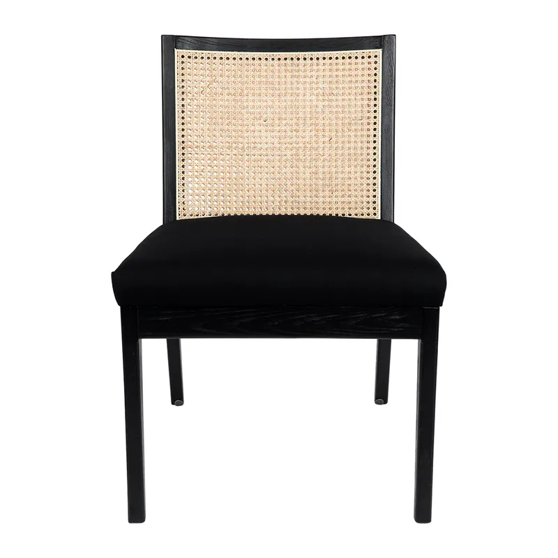 The Kane dining chair is Contemporary and Casual in style. Featuring a natural rattan back with a upholstered seat in a black linen fabric. Beautifully finished in a black birchwood frame with straight/tapered classic legs. Create a casual and contemporary style in your kitchen/dining room.